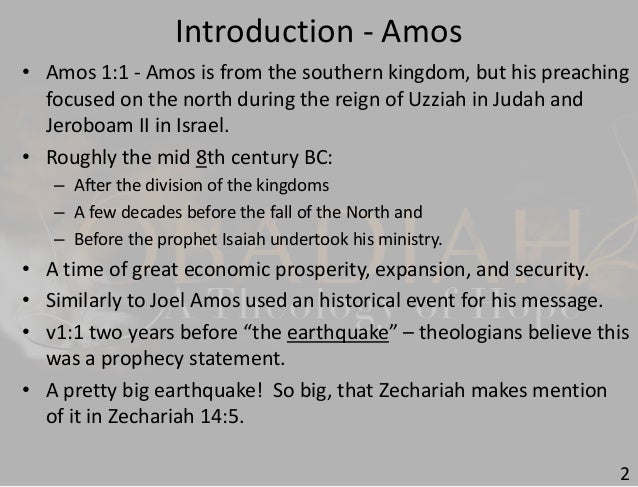 According to the new world encyclopedia, the sheep raiser amos has probably been traveling a lot to the wool and cattle markets of israel and judah. Amos’ prophetic ministry took place during the reigns of jeroboam ii, king of israel, and uzziah, king of judah. He accurately foretold the destruction of the northern kingdom of israel (although he did not specify assyria as the cause) and, as a prophet of doom, anticipated later old testament prophets.